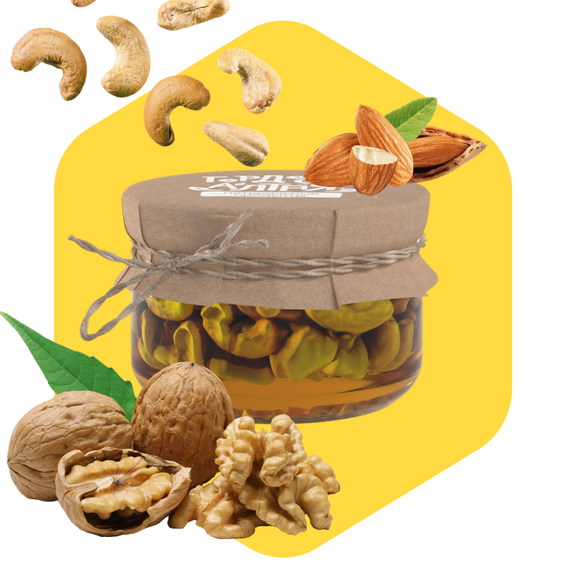 Микс орехов в цветочном мёде — это насыщенный натуральный десерт, в котором сочетаются разные виды отборных орехов и ароматный цветочный мёд из Алтайского края. Продукт представляет собой идеальный баланс вкуса, текстуры и пользы. В состав входят орехи: кешью, грецкий орех, миндаль, фундук и кедровые орешки — каждый в небольшом количестве, создавая гармоничную ореховую композицию.